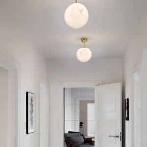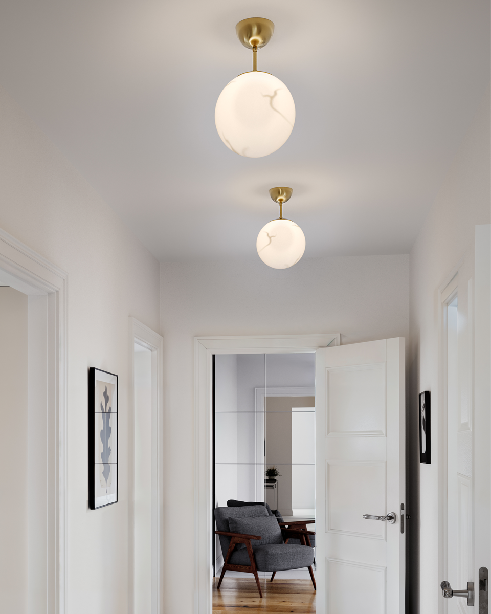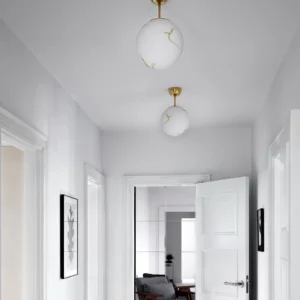 Bellagio – Stilren taklampe med retrofølelse. Bellagio er en elegant plafond med tydelig retrofølelse, designet for å gi både stil og funksjon til hjemmet ditt. Lampen består av et vakkert marmorert glass med en diameter på 25 cm, som gir et mykt og behagelig lys. Glassets unike mønster, kombinert med messingdetaljene, skaper et tidløst uttrykk som passer like godt i moderne hjem som i mer klassiske omgivelser. Plafonden egner seg spesielt godt i gang, entré eller korridor – rom der du ønsker et trivelig lys uten at lampen tar for mye plass. Skulle glasset mot formodning gå i stykker, finnes det som reservedel, noe som gjør Bellagio til et bærekraftig og langsiktig valg. Med sin kombinasjon av klassisk design, vakre materialer og praktisk funksjon, er Bellagio en utmerket plafond for deg som ønsker å løfte stemningen i hjemmet med en stilfull taklampe.
