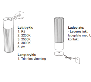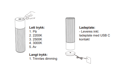 • Full kontroll på stemningen: Med trinnløs dimming og justerbar fargetemperatur (2200K, 2500K eller 3000K) kan du gå fra varmt, glødende kveldslys til et klarere lys med et enkelt tastetrykk.