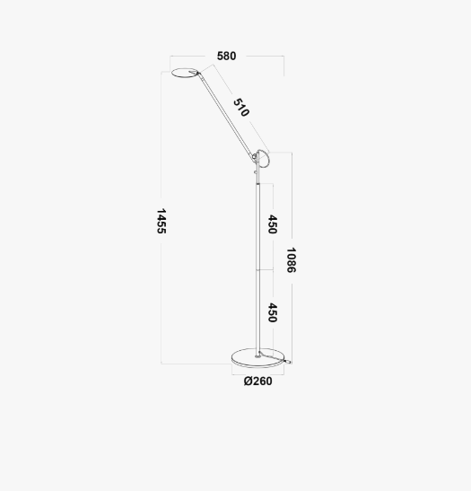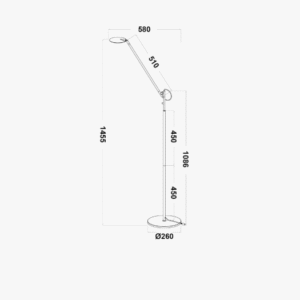 Slank og delikat gulvlampe med justerbare ledd. Touch-bryter med av/ på- og dimmefunksjon. Lampehodet er tilt- og roterbart. Armen er tiltbar. Med full spectrum CRI, gjengir lyset optimalt med fargegjengivelse av objektene den lyser på.