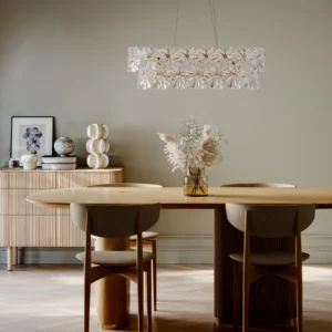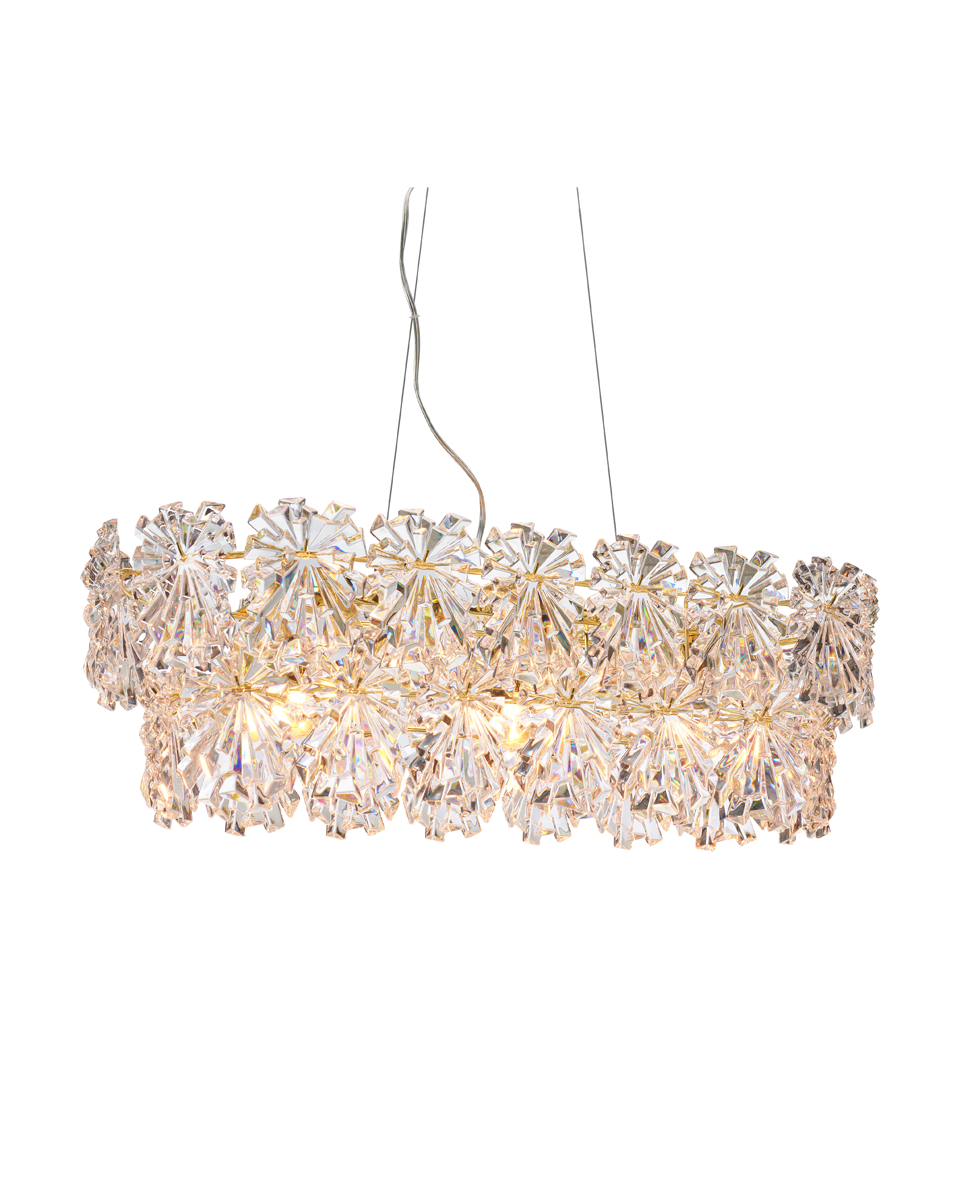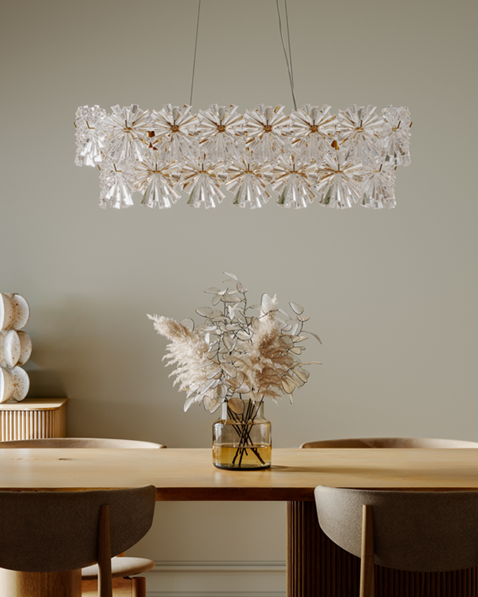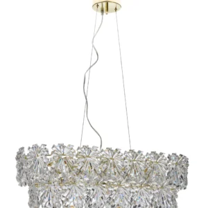 Taklampe Lorraine er en stilren og eksklusiv lampe som kompletterer vår populære Lorraine-familie perfekt. Lampen er utstyrt med klare akrylprismor som gir et fint, glitrende og luksuriøst lys i rommet. Prismene bryter lyset på en vakker måte og skaper et effektfullt lys som både gir stemning og god belysning. Stammen i blank messing gir taklampen en elegant og tidløs finish som passer i mange forskjellige miljøer og innredningsstiler. Kombinasjonen av messing og klare prismor gir en følelse av eksklusivitet og kvalitet. Lorraine er lett å plassere og passer like godt over det lille spisebordet som det store. Den er en populær modell takket være sitt elegante design og funksjonelle egenskaper. Takket være sin størrelse og form skaper den en fin balanse mellom å være et dekorativt innslag og en effektiv lyskilde. Med taklampe Lorraine får du ikke bare en vakker interiørdetalj, men også et lys som løfter rommet og skaper en trivelig stemning ved middager og samvær. Et perfekt valg for deg som ønsker eleganse og kvalitet i hjemmet.